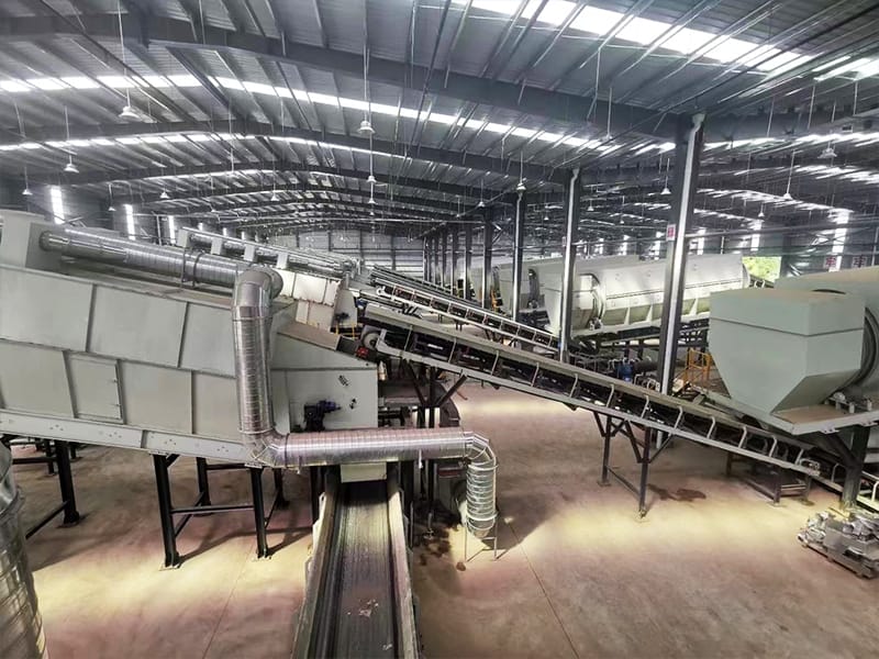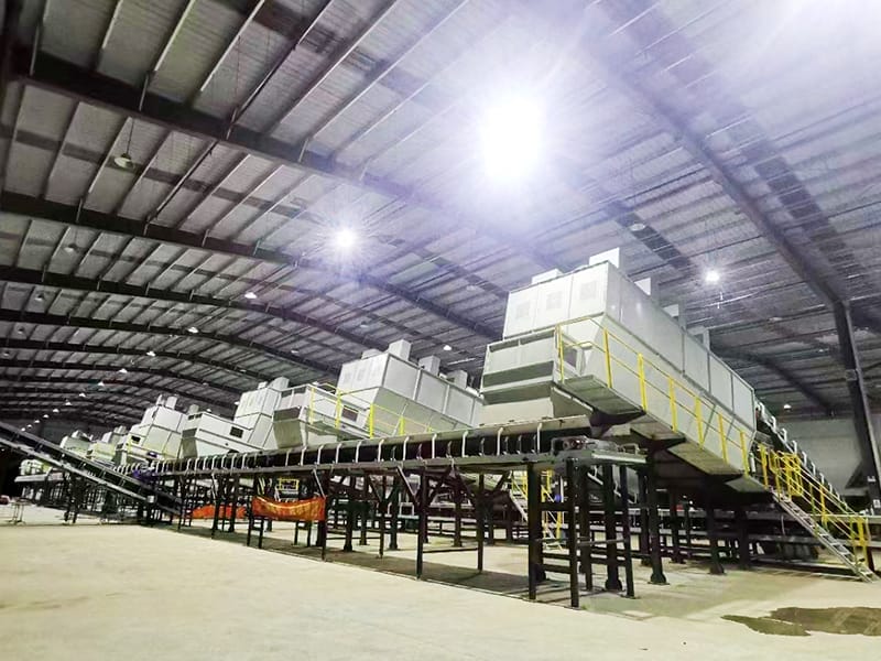 يتكون نظام معالجة نفايات المكبات بشكل أساسي من معدات مثل الغرابيل الدوارة وأجهزة الفرز والفواصل المغناطيسية. عند وصول النفايات، تمر أولاً عبر الغرابيل الدوارة التي تفصل المواد إلى أجزاء كبيرة خشنة وأجزاء دقيقة صغيرة الحجم. المادة الدقيقة هي تربة دبال، في حين يخضع الجزء الكبير لفصل هوائي لتقسيمه إلى مواد ثقيلة وخفيفة. الجزء الخفيف يتكون بشكل رئيسي من نفايات البلاستيك، بينما يشمل الجزء الثقيل تربة الدبال وحطام البناء. ثم تتم إزالة المعادن الحديدية من تربة الدبال وحطام البناء باستخدام الفواصل المغناطيسية.