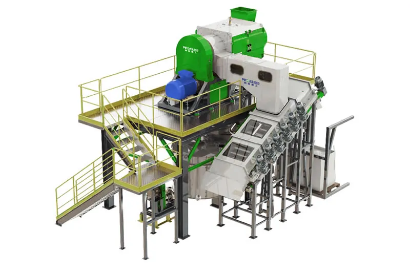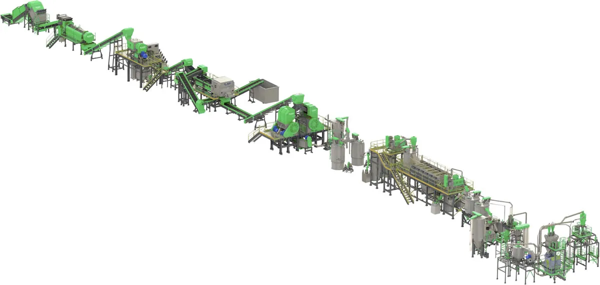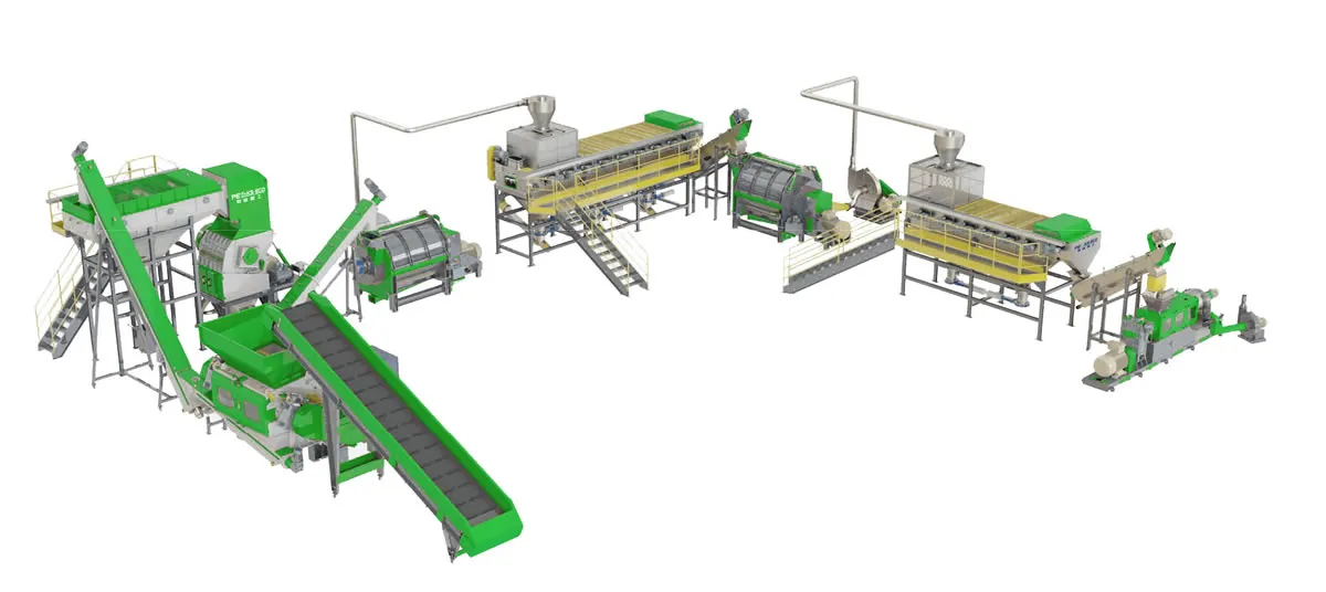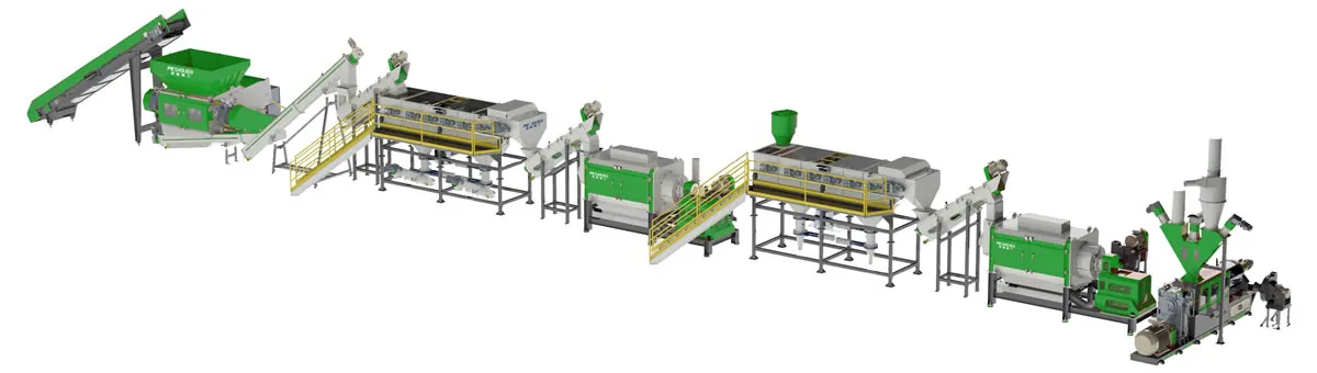 من خلال قدرته على معالجة كل من الأفلام والمواد الصلبة، يزيد هذا الخط من أنواع نفايات البلاستيك التي يمكن التعامل معها. في المرحلة الأمامية، تقوم الفرامة (آلة التقطيع) بتقليل حجم نفايات البلاستيك لتسهيل معالجتها. بعد ذلك، تخضع المواد لعمليات تنظيف مكثفة باستخدام غسالات الاحتكاك وغسالات التوربين، يليها فصل البلاستيك الثقيل والملوثات داخل خزان الغمر والطفو. وبحسب نوع البلاستيك، يتم استخدام معدات تجفيف متخصصة لإزالة الرطوبة.