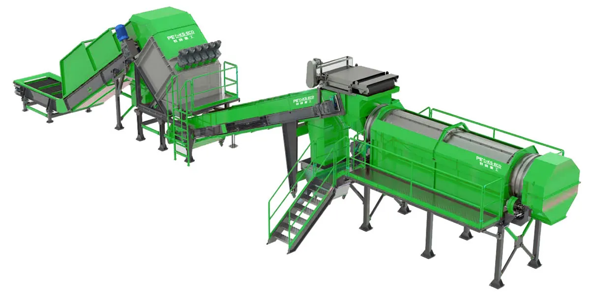 يتضمن خط غسيل PET عمليات مثل الغسيل الأولي والفرز، والسحق، والفصل بالغمر والطفو، والغسيل الساخن والبارد، وإزالة الملصقات، والتجفيف. تدخل نفاياتPET أولاً مرحلة الغسيل الأولي لتنظيف السطح، ثم تفرز يدوياً أو آلياً. بعد ذلك، تسحق المواد، وتخضع الرقائق الناتجة لعملية تنظيف شاملة في وحدات الغسيل الساخن والبارد. وأخيراً، تمر رقائق PET النظيفة والمجففة بمرحلة إضافية لإزالة الملصقات والشوائب للحصول على مادة عالية النقاء.